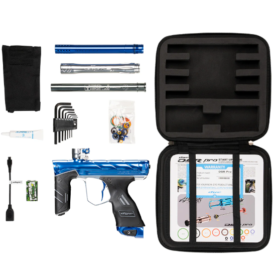 Features an EVA foam lining for secure protection of the DSR Pro. DYE Slick Lube Advanced, DSR Pro parts kit, quick-start guide, DYE Core Allen key set, 9-bolt battery, barrel sock, and .688 UL-i aluminum insert are included with the marker.