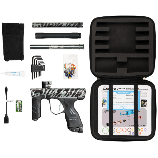 Features an EVA foam lining for secure protection of the DSR Pro. DYE Slick Lube Advanced, DSR Pro parts kit, quick-start guide, DYE Core Allen key set, 9-bolt battery, barrel sock, and .688 UL-i aluminum insert are included with the marker.