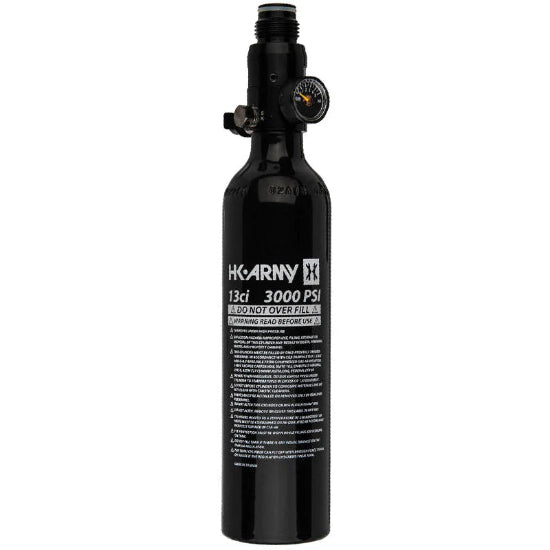 HK Army 13ci 3000psi alloy aluminum compressed air tanks for paintball and airsoft are a great alternative to carbon fiber systems. The aluminum tanks come with the standard high-pressure compressed air regulator set to the standard output pressure of 800psi.